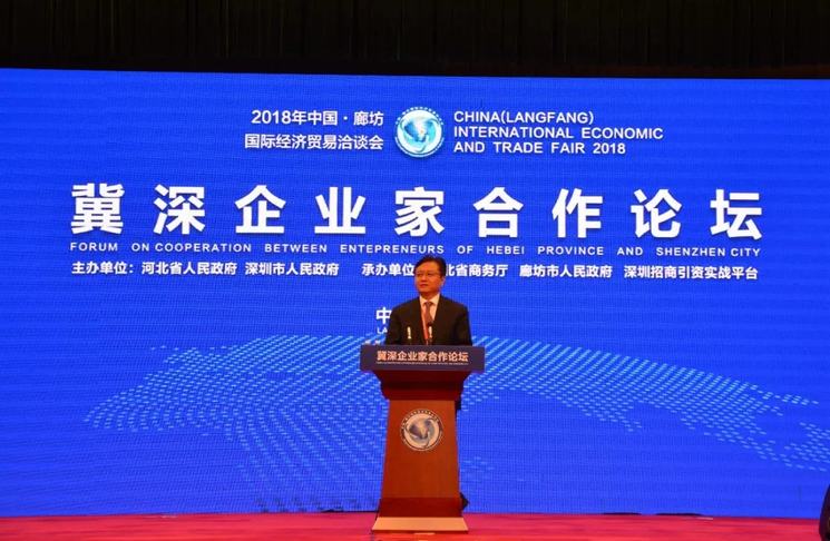 5月17日,由河北省政府、深圳市政府主办,平台与河北省商务厅、廊坊市政府共同承办的“冀深企业家合作论坛”在河北廊坊举行,本次活动是“5·18”经洽会三大高端主题活动之一。平台组织邀请的58家企业(机构)129人与河北200名企业家共同参加会议。深圳证券交易所理事长吴利军;TCL集团(000100)董事长李东生、华大基因(300676)董事长汪建、金蝶软件集团(00268.HK)董事局主席徐少春、华讯方舟(000687)董事长吴光胜、铁汉生态(300197)董事长刘水、欣旺达(300207)董事长王威、证通电子(002197)董事长曾胜强、信立泰药业(002294)总经理叶宇翔、光启(00439.HK)党委书记高国辉、兆新能源(002256)董事局副主席郭健及大族激光(002008)、怡亚通(002183)、康佳集团(000016)、深圳燃气(601139)、比亚迪(002594)、特发信息(000070)、迈瑞(MR)、金溢科技(002869)、达实智能(002421)、中海重工(00651.HK)、维业股份(300621)、文科园林(002775)、任子行网络(002583)等31家上市公司负责人;独角兽企业柔宇科技董事长刘自鸿、越海全球物流董事长张泉;金融机构深创投董事长倪泽望、前海母基金首席执行事务合伙人靳海涛等深圳电子信息、新能源、新材料、生物医药、高端制造、现代服务、金融投资等行业企业家;深圳大智移云相关行业协会负责人等共同出席论坛。河北省政府省长许勤、深圳市政府副市长高自民、深圳证券交易所理事长吴利军出席论坛并分别致辞。